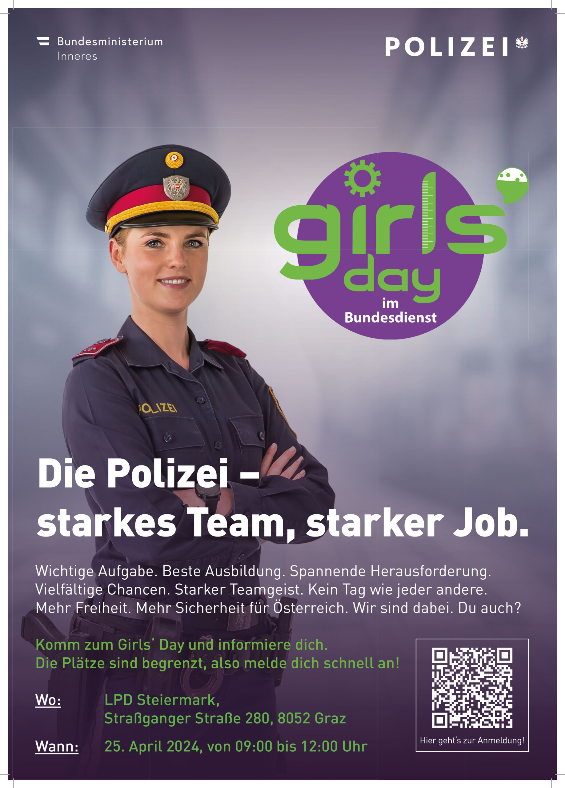 Graz, Steiermark. – Die steirische Polizei möchte sich rund um den „Girls´ Day Steiermark 2024“ entsprechend präsentieren. Interessierte Mädchen und Frauen ab dem 14. Lebensjahr erhalten am Donnerstag, 25. April 2024, spannende Einblicke in den Alltag einer Polizistin. Auch die steirische Polizistin und Spitzensportlerin Conny Hütter nimmt an der Veranstaltung teil.