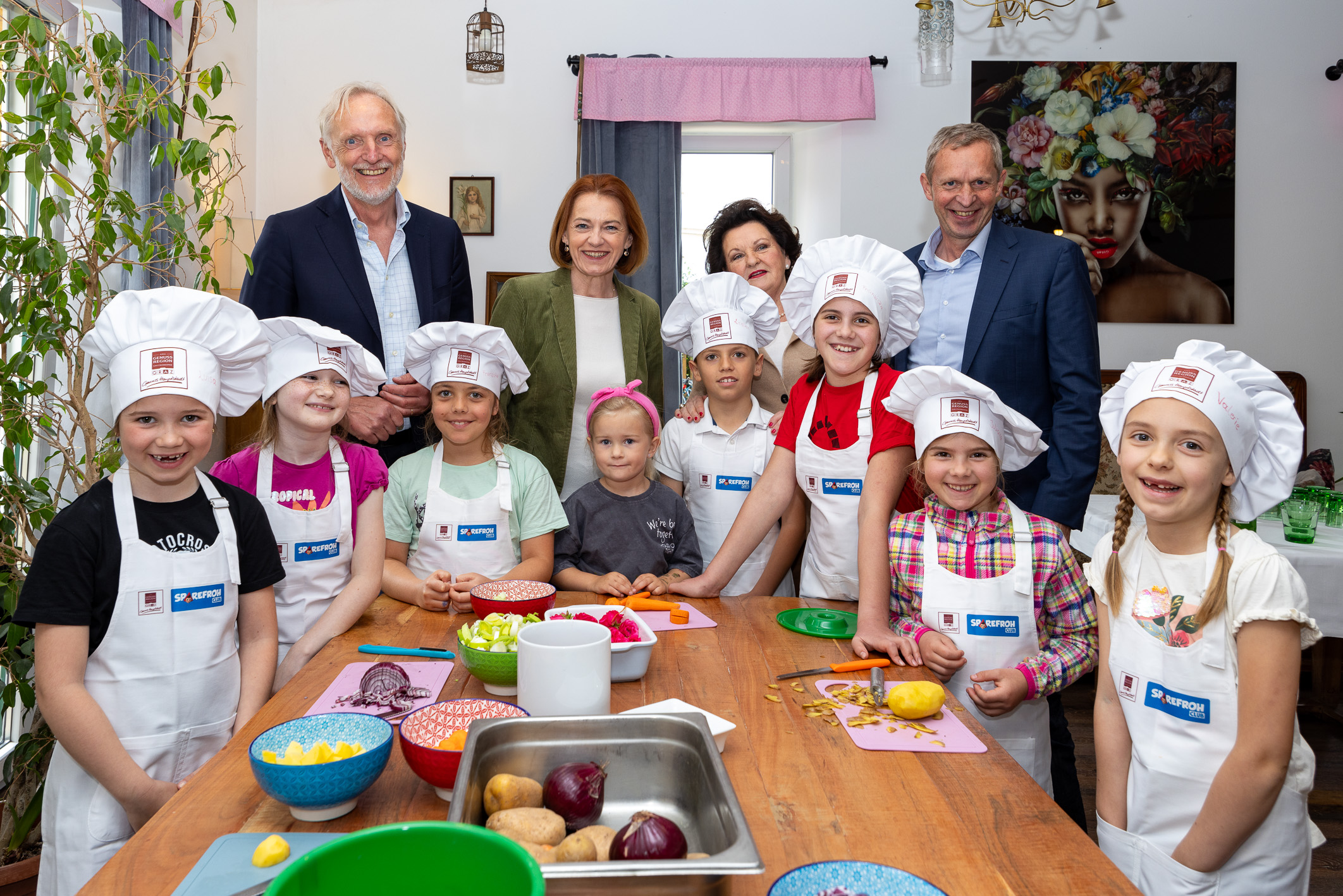 Zum Abschluss der heurigen Kinderkochkurs-Saison schauten die Agrarlandesrätin Simone Schmiedtbauer und der Wirtschafts- und Tourismusstadtradt Günter Riegler den engagierten Jungköchen über die Schultern: