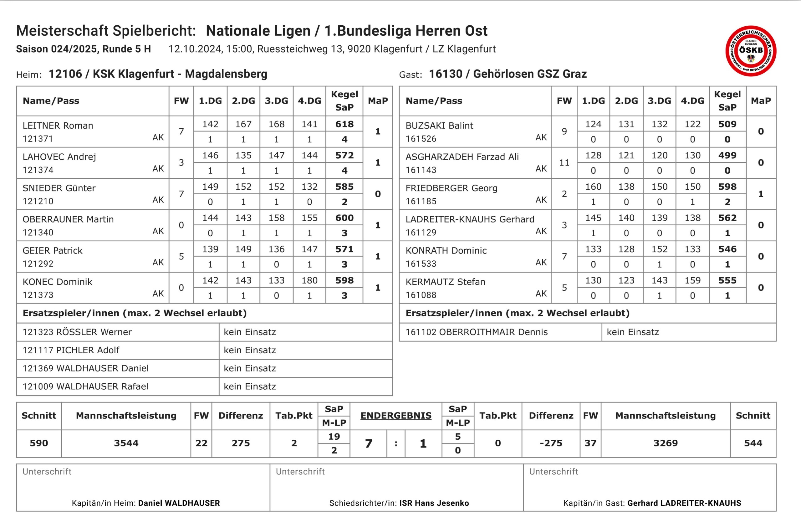 Im Heimspiel des KSK Klagenfurt-Magdalensberg gegen Aufsteiger Gehörlosen GSZ Graz war die Favoritenrolle klar auf Seiten der Kärntner, und so verlief auch das Spiel. Im ersten Umlauf erzielte Roman Leitner mit 618 Kegel gleich die Tagesbestleistung und gewann sein Spiel deutlich mit 4:0 Satzpunkten und einem Plus von 109 Kegel. Auch Andrej Lahovec hatte mit 572 Kegel leichtes Spiel und gab ebenfalls keinen Satzpunkt ab. Lediglich Günter Snieder jun. hatte trotz persönlicher Bestleistung von 585 Kegel gegen den besten Spieler der Grazer, Georg Friedberger, der 598 Kegel erzielte, knapp das Nachsehen. Mit 2:1 Mannschaftspunkten bei einem Kegelvorsprung von 169 Kegel übergab das Trio zur Halbzeit. Im zweiten Umlauf kamen die Grazer zwar etwas besser zurecht, aber sowohl Martin Oberrauner mit 600 Kegel, Patrick Geier mit 571 Kegel und Dominik Konec mit 598 Kegel konnten ihre Spiele mit jeweils 3:1 Satzpunkten für sich entscheiden und den 7:1 Endstand fixieren. Mit neuerlich 590 Schnittkegel wurde die gute Form unter Beweis gestellt und ein Vorsprung von satten 275 Kegel erspielt.