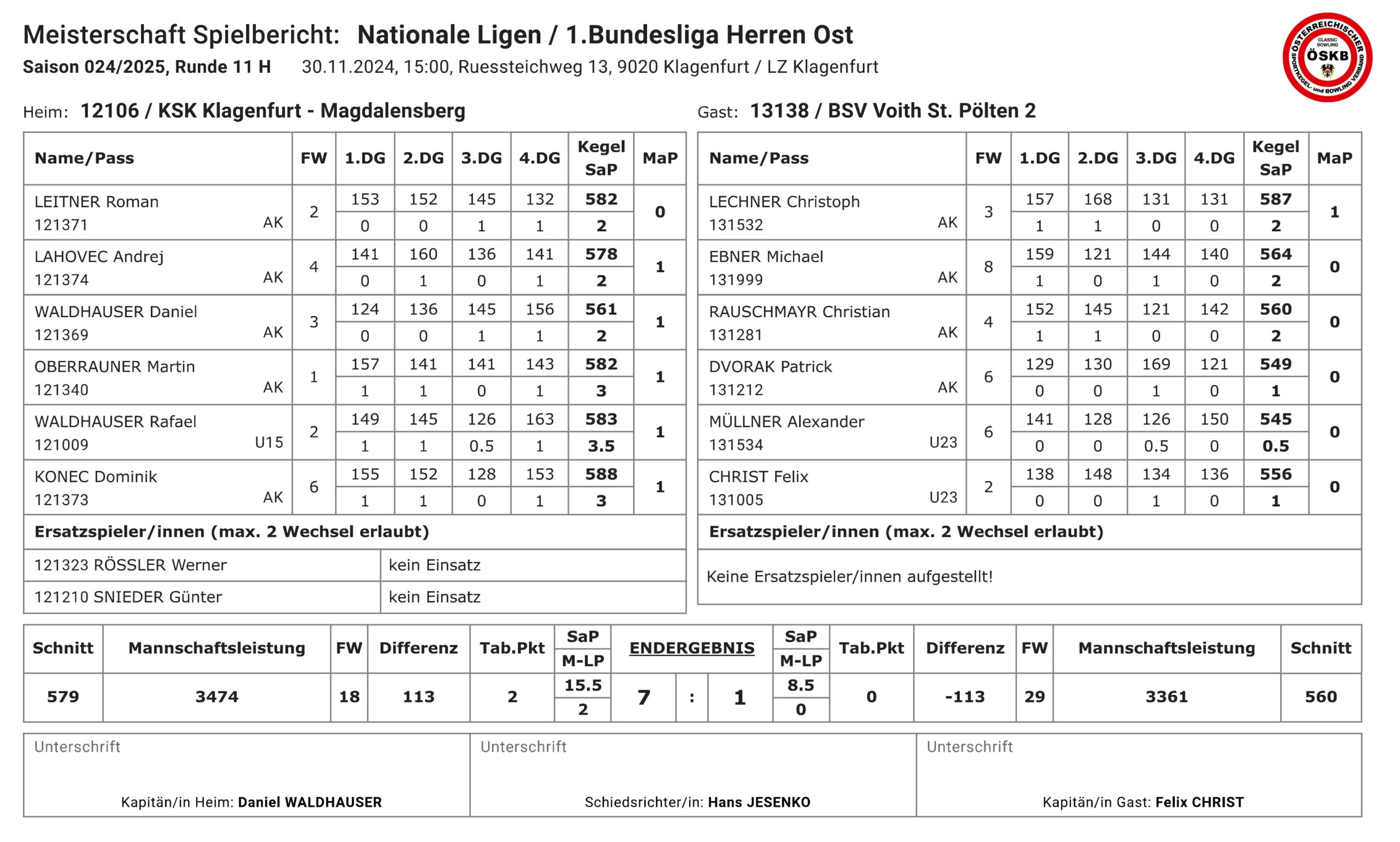 Endstand: 7:1 bei 15,5:8,5 Sätzen und 3474:3361 Kegel für den KSK Klagenfurt-Magdalensberg