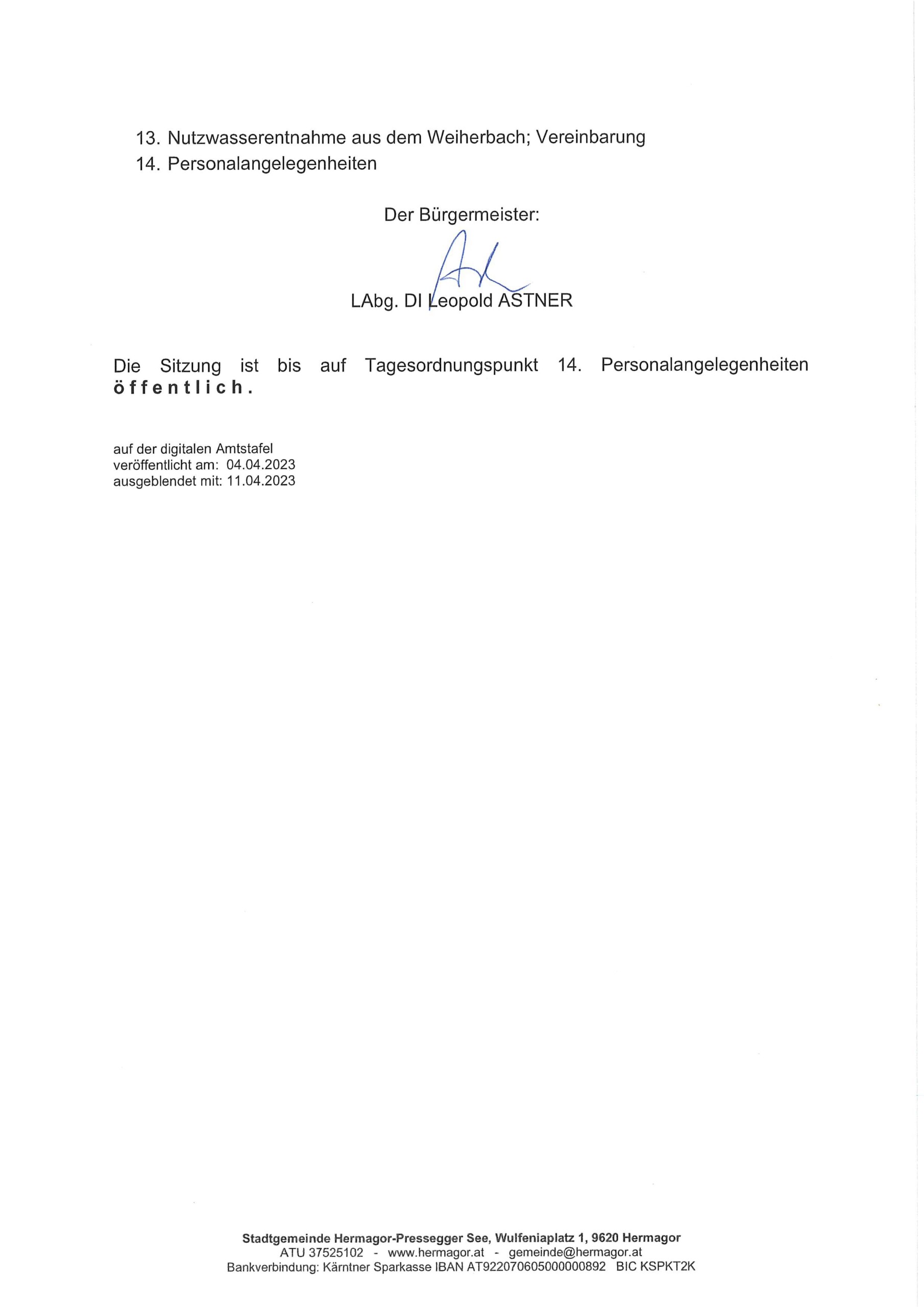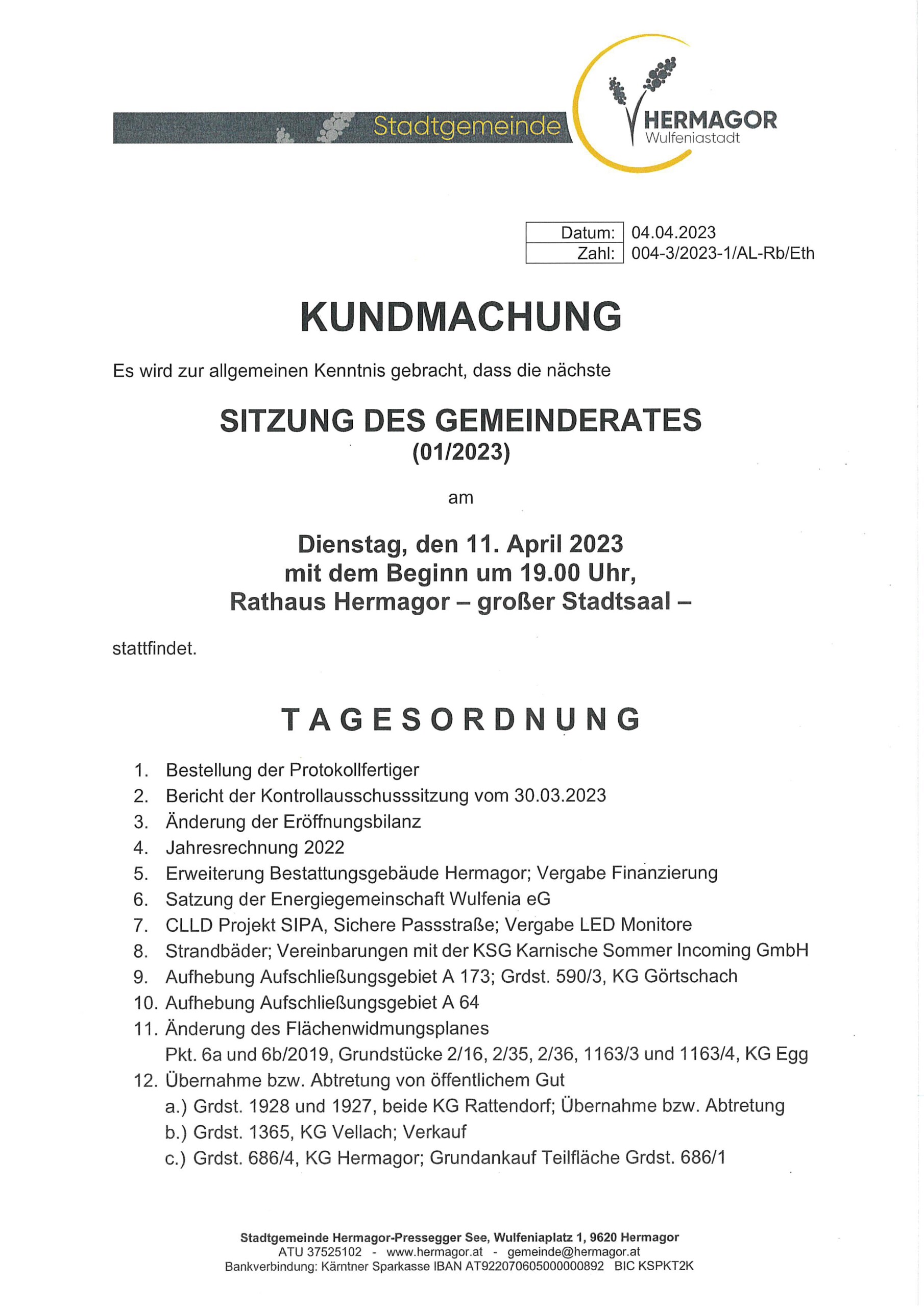 Kundmachung zur Sitzung des Gemeinderates am Dienstag, dem 11. April 2023, mit Beginn um 19:00 Uhr, im Rathaus Hermagor – großer Stadtsaal