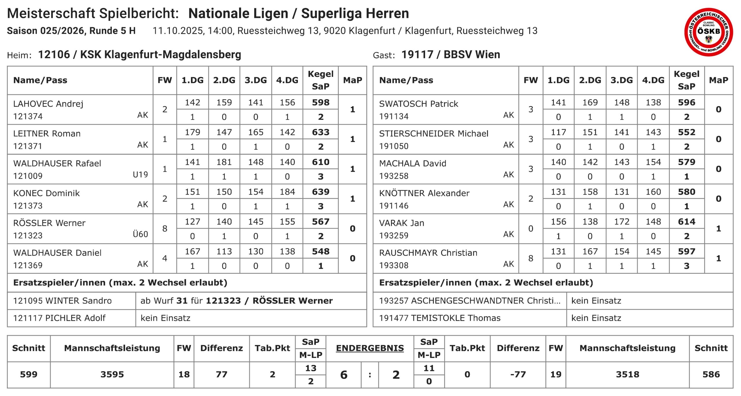 Im zweiten Superliga-Heimspiel traf der KSK Klagenfurt-Magdalensberg im Leistungszentrum des Kärntner Sportkeglerverbandes auf BBSV Wien, dem österreichischen Rekordmeister. Rekordmeister ja, aber die glorreichen Zeiten der Wiener im Herrenbereich liegen schon knapp zwei Jahrzehnte zurück. Die Zeiten haben sich geändert und beide Mannschaften spielen vorrangig um den Klassenerhalt.